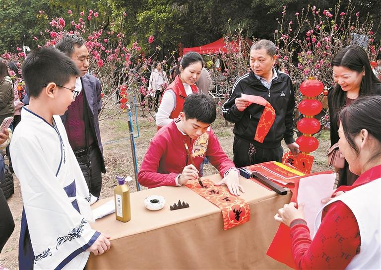 当天,悠悠乐声中,专业朗诵者、本地学校学生,接连演绎、朗诵唐寅的《桃花庵歌》等古今与桃花相关的经典诗词。书法家现场挥毫泼墨,参与者漫步桃林,沉醉在桃花美景中,即兴创作诗词,他们还参与诗词接龙、飞花令等互动游戏,在赏桃花、诵桃花等交流互动中,在诗意流淌的桃林中感受春日之盎然、桃花之美艳、传统文化之魅力,共度一个桃花与诗词萦绕的元宵佳节。