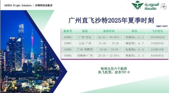 记者从活动上获悉,中沙直航航班日益增长,目前每周有23班直航航班,分别从北京、上海、广州、深圳、中国香港直飞到沙特。其中,沙特航空每周有6班从广州飞往沙特的直航航班。随着中沙直航运力的提升与数字化服务体系的不断完善,预计2025年赴沙特的中国游客量将突破50万人次。