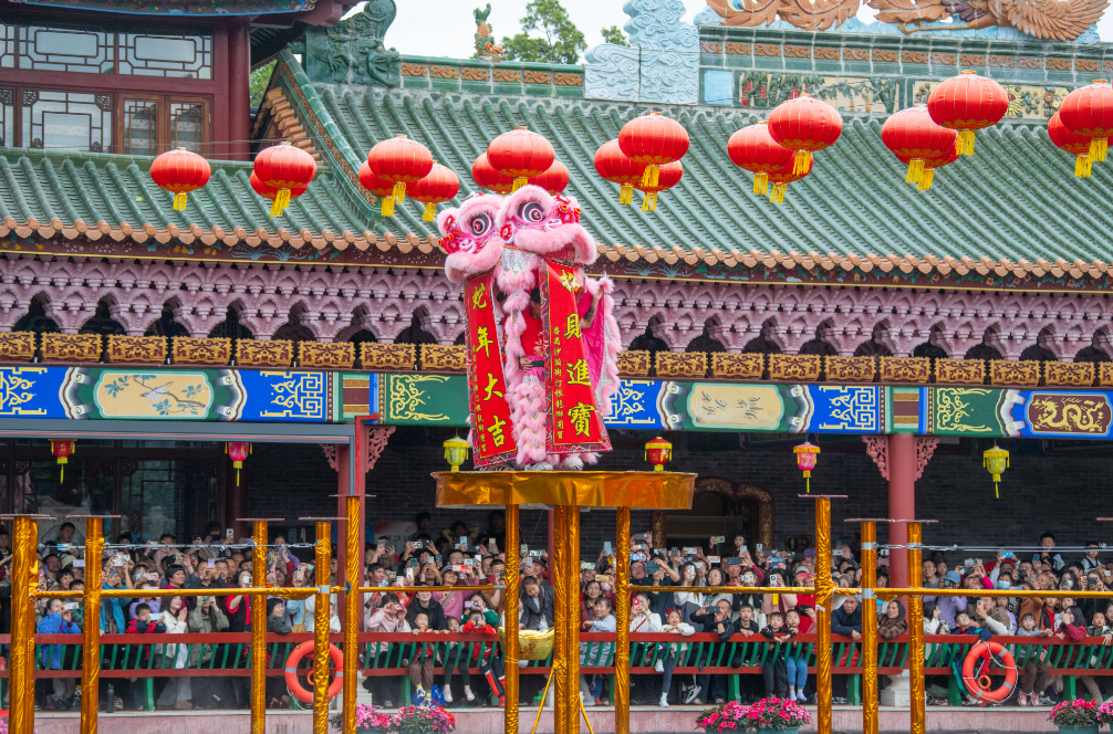 广州深厚的传统文化,吸引着八方来客。图为大年初三,宝墨园新春岭南醒狮民俗文化节在荔景湖上演。
