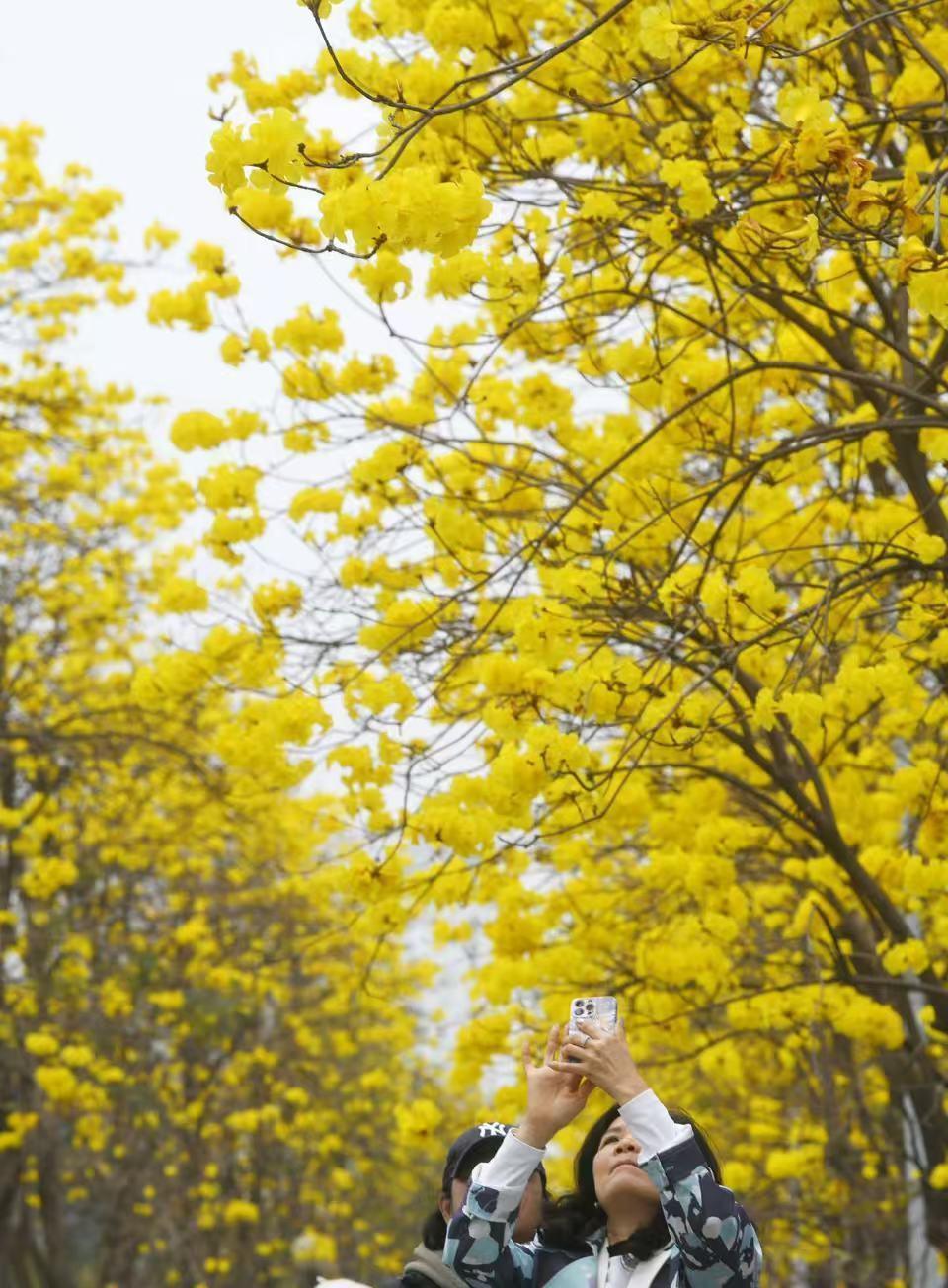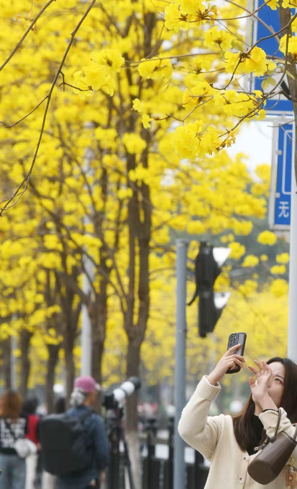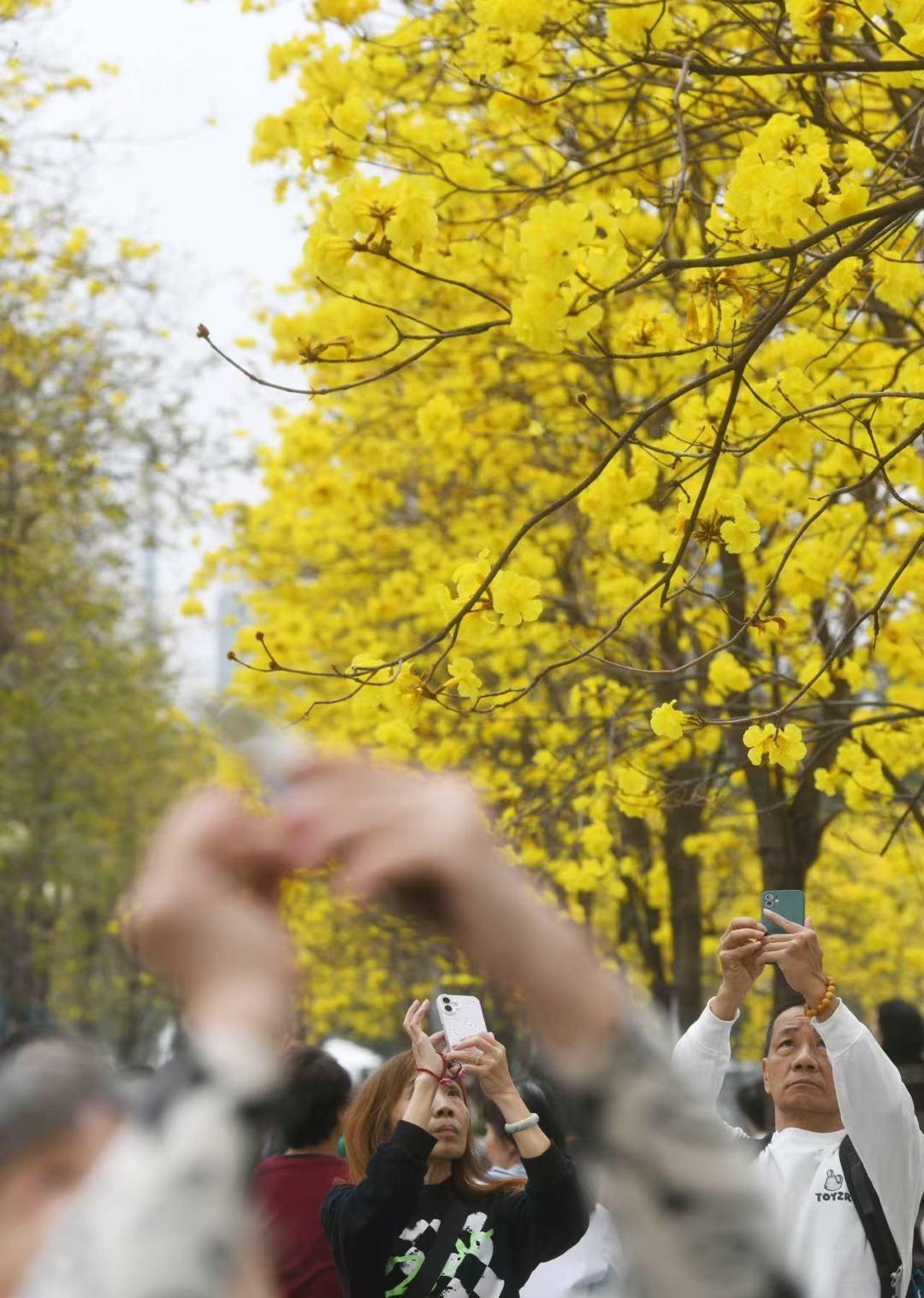 2月17日下午,环岛路迎来赏花高峰期,记者现场看到,市民趁着黄花风铃木盛放前来观赏,尤其是不少摄影爱好者扛着长焦镜头在花径流连,这条“金色长廊”成为市民的天然影棚。