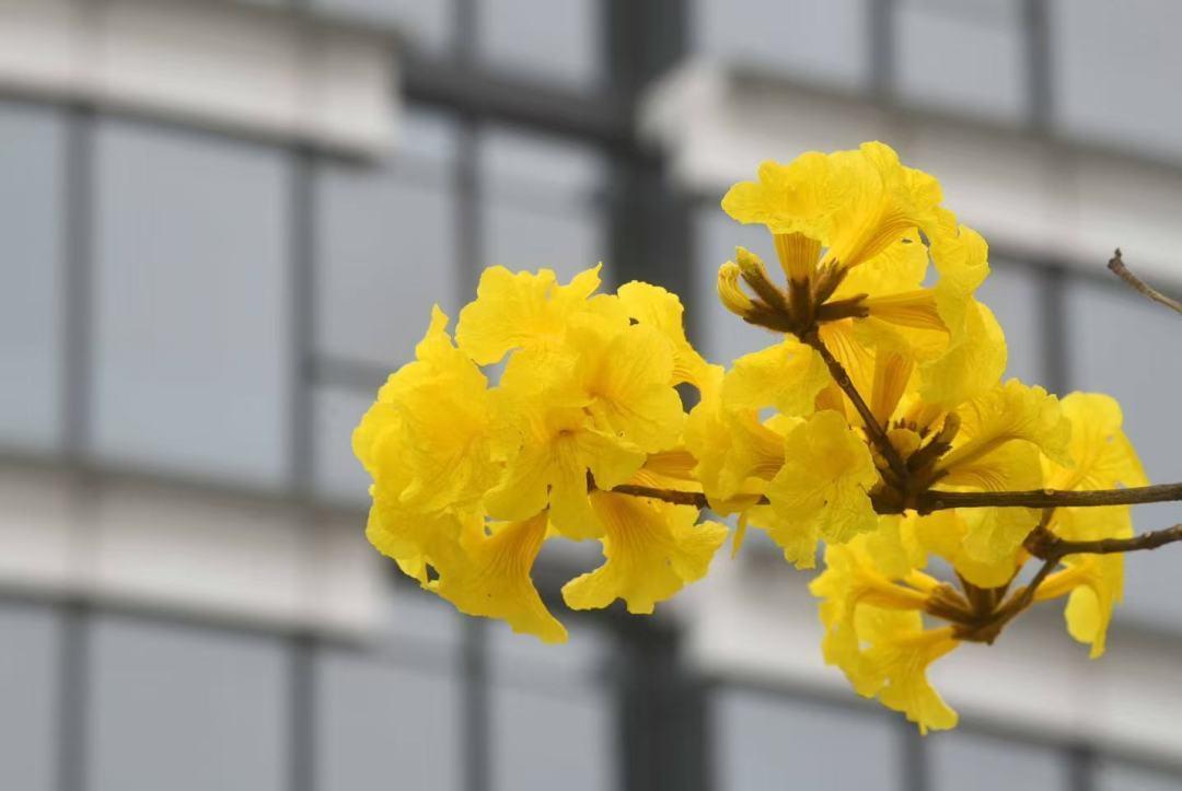 黄花风铃木为紫葳科风铃木属落叶或半常绿乔木,原产于中美洲、南美洲,分布于世界热带地区。黄花风铃木花色金黄艳丽,花形如风铃,季相变化明显,是热带地区优良观花树种,花期一般为2-4月。