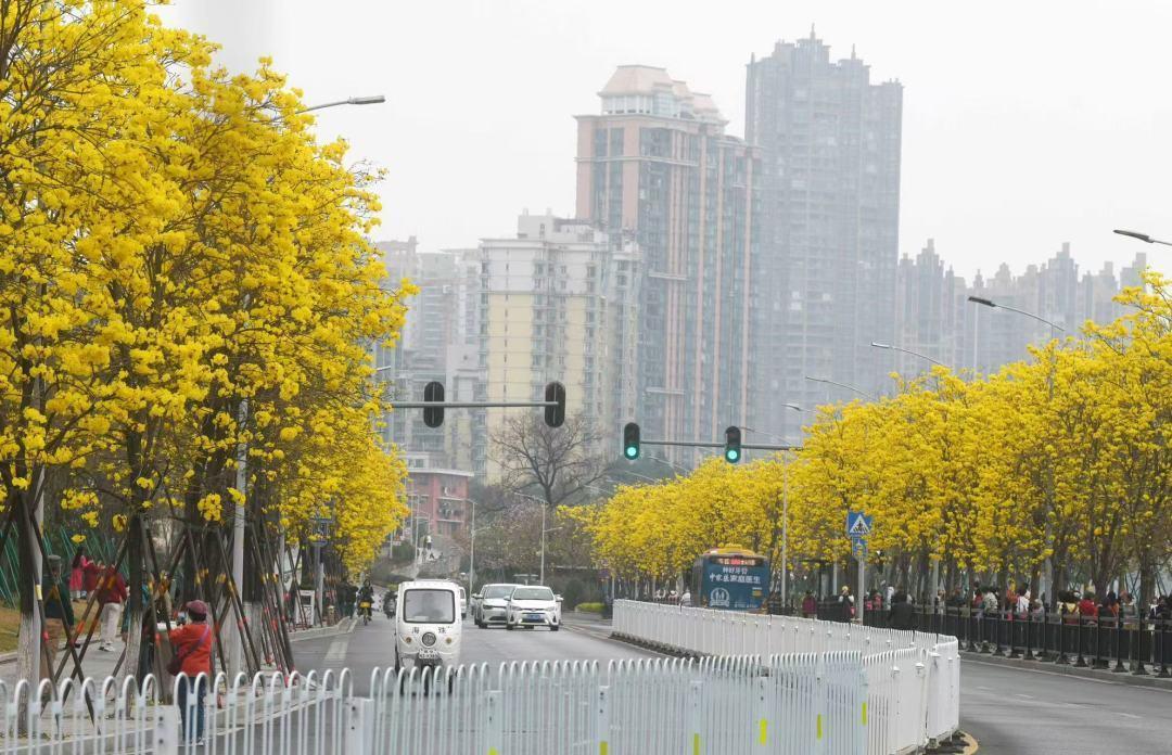 2月的广州,气温回升,春意正酣。海珠区洲头咀公园旁的环岛路近日又迎来了一年中绚烂的时节——绵延数百米的黄花风铃木竞相绽放,金灿灿的花海与珠江碧波相映成趣,勾勒出一幅流动的春日画卷。