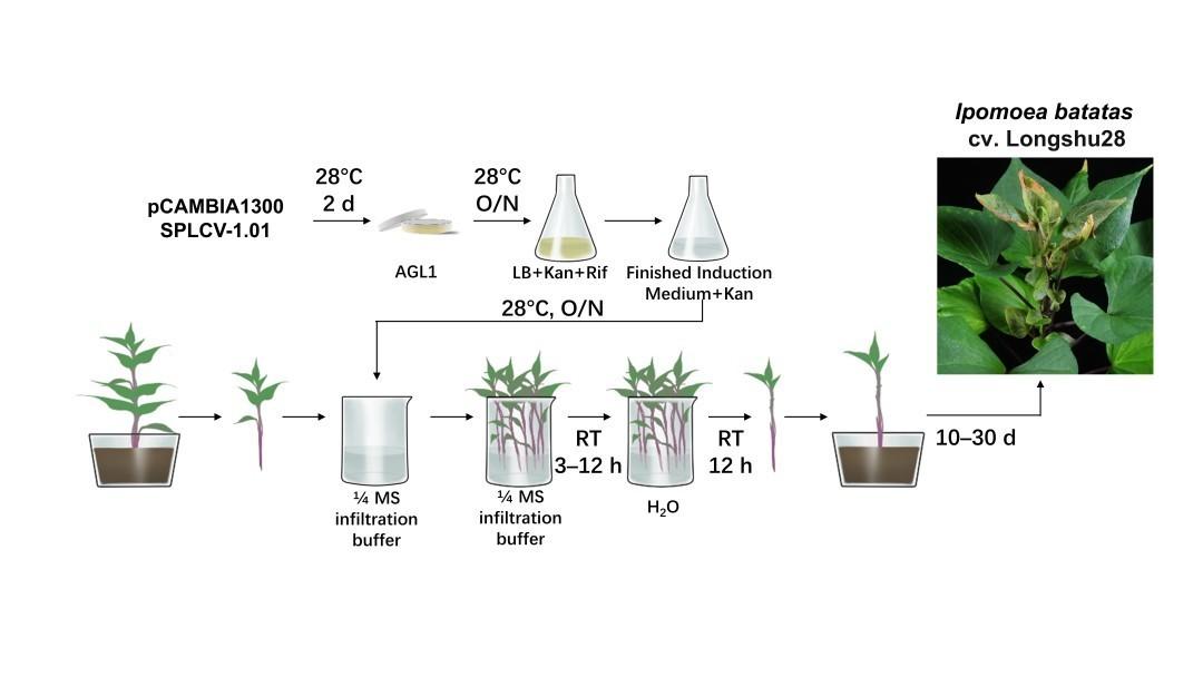 双生病毒科是病毒界中最大的一个科。双生病毒通常含有一个或两个单链环状DNA,分别称为单组分双生病毒和双组分双生病毒,单组分双生病毒通常还伴随一个卫星DNA。甘薯曲叶病毒是单组分双生病毒,是危害甘薯产业最严重的DNA病毒。邓书林团队今年上半年发表文章,建立了简便高效的甘薯曲叶病毒侵染体系,并利用SBG51卫星DNA设计了病毒诱导的基因沉默(VIGS)系统,该体系为甘薯抗病育种以及功能基因研究奠定了基础。