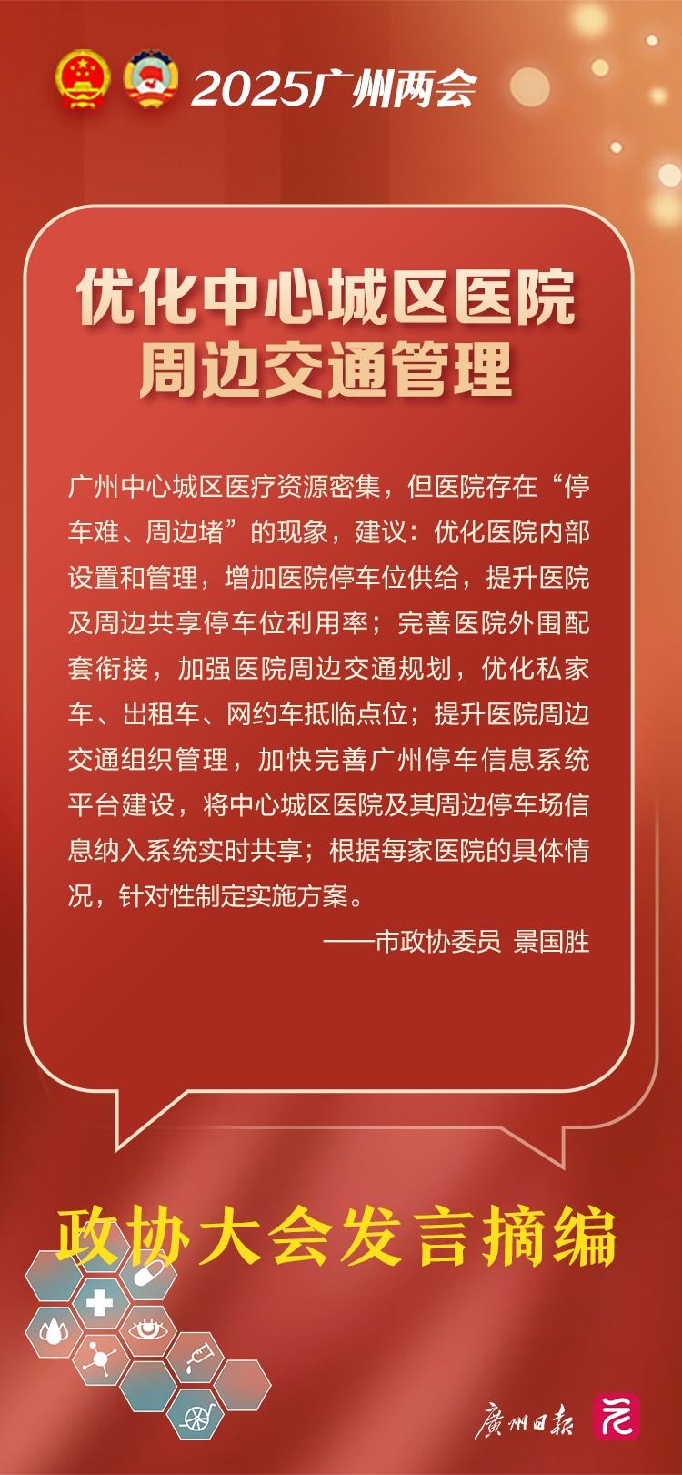 2月19日,广州市政协十四届四次会议举行大会发言。市政协委员景国胜代表市政协城建资源环境委、台盟广州市委会发言时提出,在广州,60.4%的医院、72.2%的床位和65.7%的医院建筑面积均集聚在中心城区,中心城区医院周边是广州交通的一个主要梗阻点,存在“停车难、周边堵”的现象,不仅影响了患者的就医体验,也给周边居民的生活和出行带来不便。针对这一现象,他建议从“缓解周边堵”和“破解停车难”两方面优化中心城区医院周边交通管理。