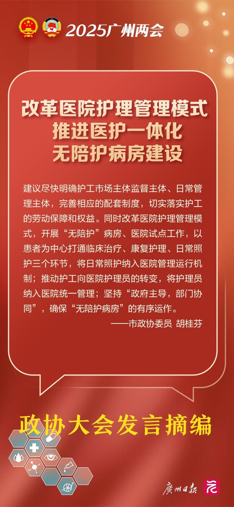 市政协委员胡桂芬代表市政协文化文史和学习委、民革广州市委会发言表示,在医院临床治疗、康复护理、生活照护三环节中,生活照护被归为患者或患者家属的分内事。当前,医患对护工的需求不断增长,但护工职业队伍停留在初级、传统阶段,陪护困境依然存在。