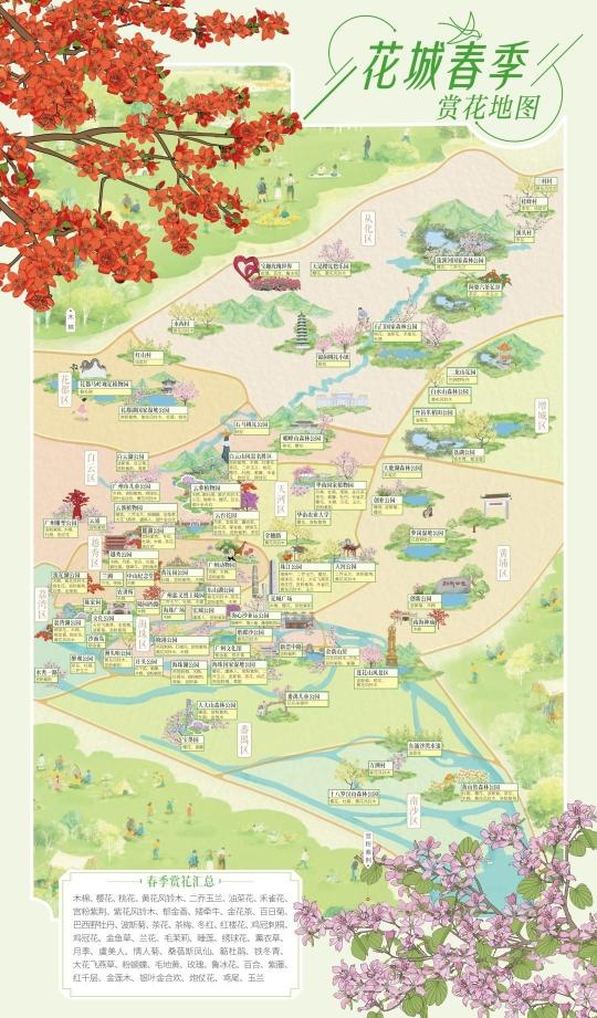 “若待上林花似锦,出门俱是看花人。”花城赏花地图,选取花城各大公园、旅游景点及盛花路段的主要赏花点,用方便查阅的插画形式,为“看花人”绘制可以一键收藏、了解花城花貌花况、领略花城之美的赏花指引。