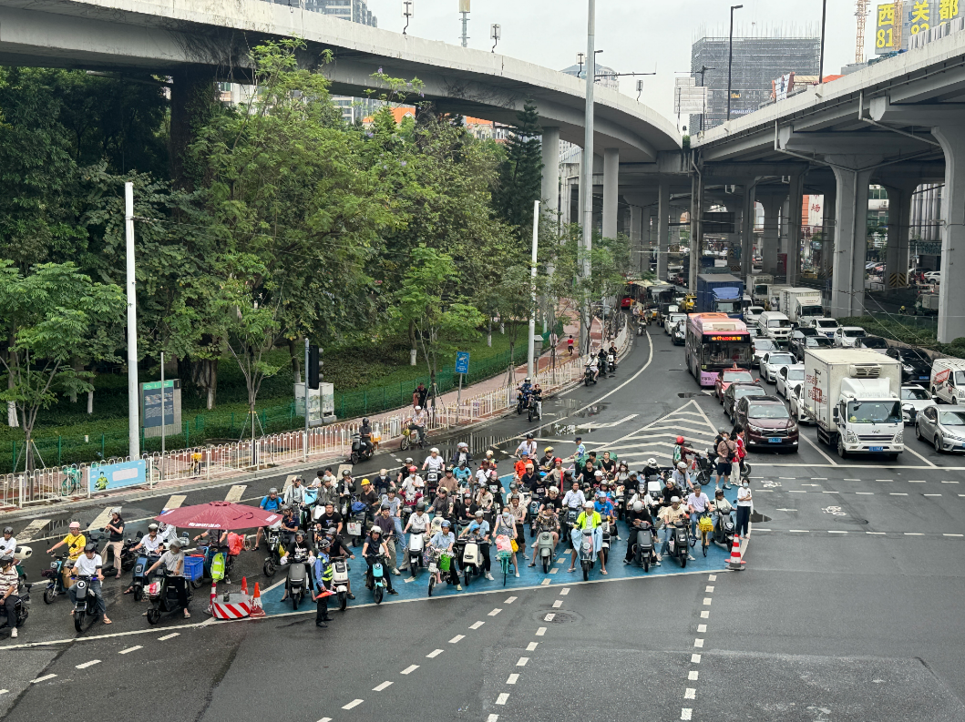 广州不断加强非机动车道建设改造工作,积极完善机非隔离、信号灯、标志标线等交通设施,逐步优化电动自行车通行条件。
