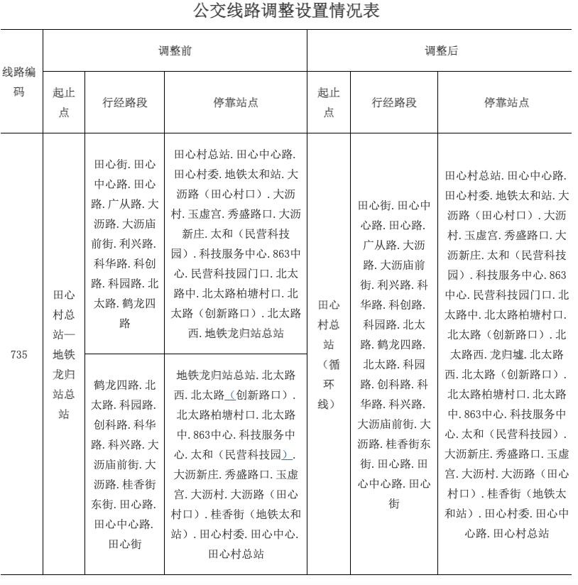 (七)调整公共汽车735路由公共汽车田心村总站至公共汽车地铁龙归站总站运作改为公共汽车田心村总站循环线运作,并取消停靠公共汽车地铁龙归站总站,增加停靠公共汽车龙归墟站(南行)(具体调整情况见附件);公共汽车地铁龙归站总站调整至原总站对出鹤龙四路路侧运作,公共汽车728、夜86路等线路停靠此站。