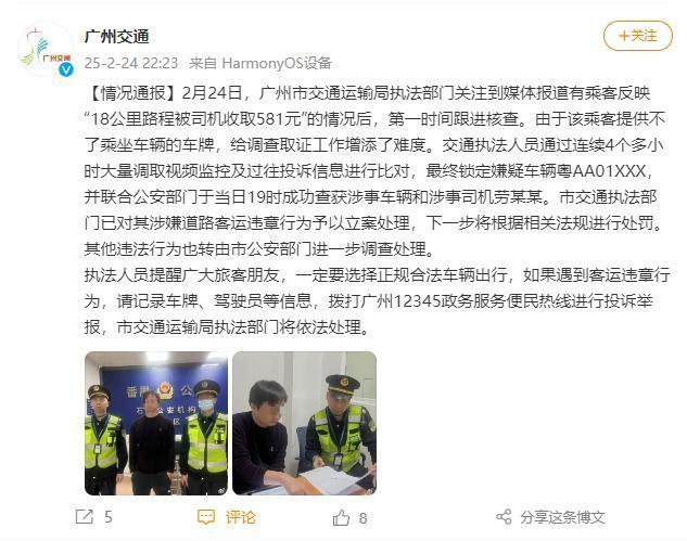 中新网2月25日电 据广州市交通运输局官方微博消息,广州市交通运输局发布情况通报称,2月24日,广州市交通运输局执法部门关注到媒体报道有乘客反映“18公里路程被司机收取581元”的情况后,第一时间跟进核查。