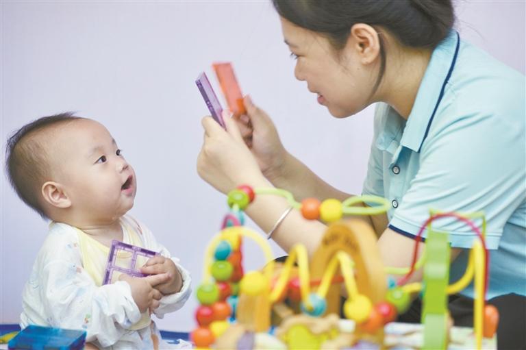 越秀区光塔街普惠托育园里,专业育儿师正在和幼儿玩耍。(资料图片) 广州日报全媒体记者王燕 摄