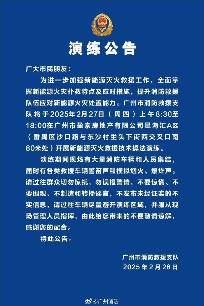 2月26日,广州市消防救援支队官方微博发布演练公告称,为进一步加强新能源灭火救援工作,全面掌握新能源火灾扑救特点及应对措施,提升消防救援队伍应对新能源火灾处置能力,广州市消防救援支队将于2025年2月27日(周四)上午8:30至18:00在广州市盈泰房地产有限公司星海汇A区(番禺区沙口路与东沙村坣头下街西交叉口南80米处)开展新能源灭火救援技术操法演练。