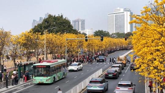 二月份黄花风铃木如期盛放,位于海珠区洲头咀公园片区是广州黄花风铃木开花规模最大的地方之一。图/广州日报新花城记者:高鹤涛 通讯员 公交宣