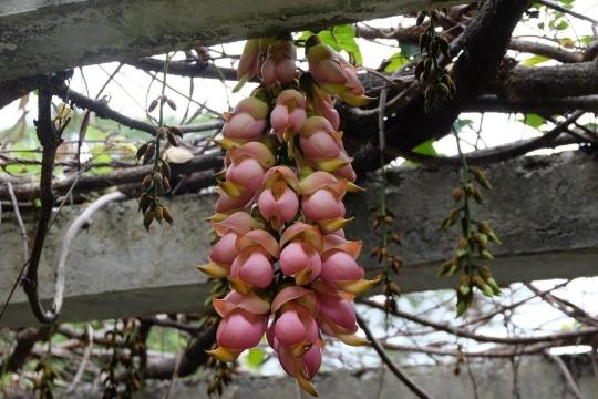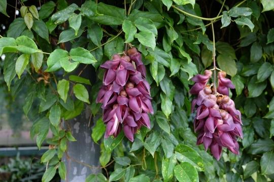 除了禾雀花,植物园内还有两种形似小鸟的花——翡翠葛和紫矿,它们和禾雀花一样都是豆科植物。目前,温室群景区-奇异植物室的翡翠葛可见几串比较小的花蕾,热带雨林室二层木栈道上的翡翠葛尚未见花蕾。预估今年翡翠葛的花期会晚于禾雀花,两者不重合。