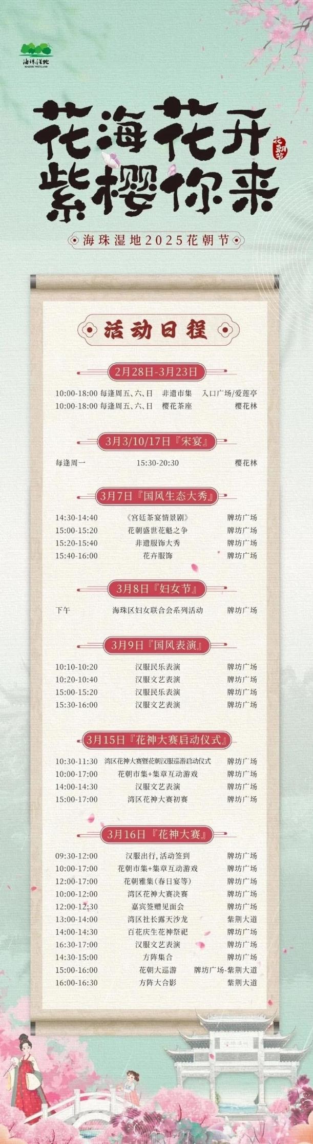 活动内容:阳春三月,2025海珠湿地花朝节徐徐拉开帷幕,浪漫花神大赛向你发出春日邀约。