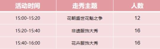 活动内容:国风生态大秀融合了国风与花卉,赴今年最热烈的花期之约。国风生态大秀分为三大主题,分别是花朝盛世花魁之争、非遗服饰大秀、花卉时装大秀。现场还精心准备了换装体验环节,游客可以沉浸式参与国风大秀。