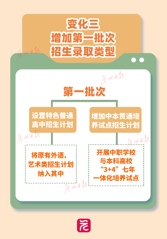 广州拟在招生录取第一批次设置特色普通高中招生计划,将原有外语、艺术类招生计划纳入其中,深化普通高中育人方式改革,推动普通高中多样化特色发展;在第一批次增加中本贯通培养试点招生计划,开展中职学校与本科高校“3+4”七年一体化培养试点,畅通技术技能人才成长通道。