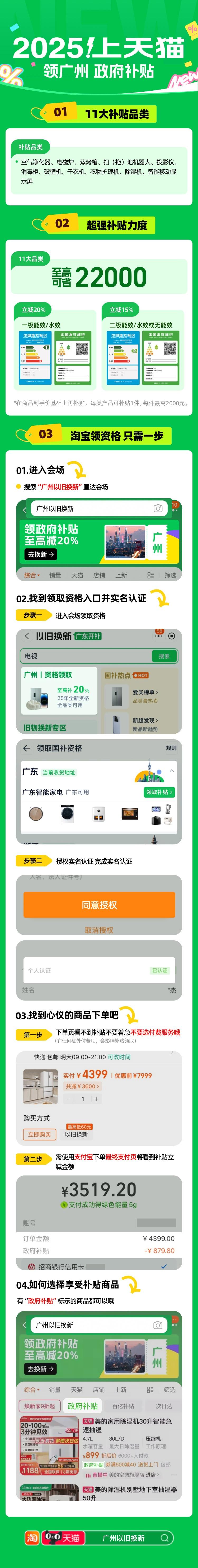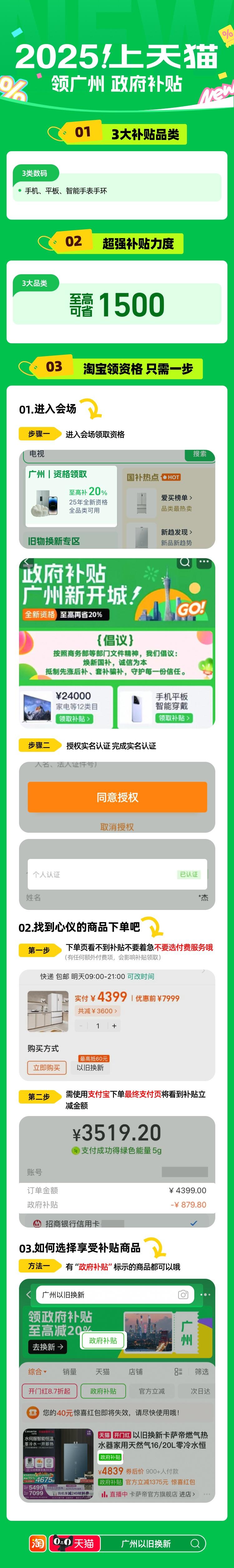 上淘宝APP 搜索“广州以旧换新”进入“广州专区”,领取补贴资格并完成实名认证后,通过支付宝方式即可使用补贴。