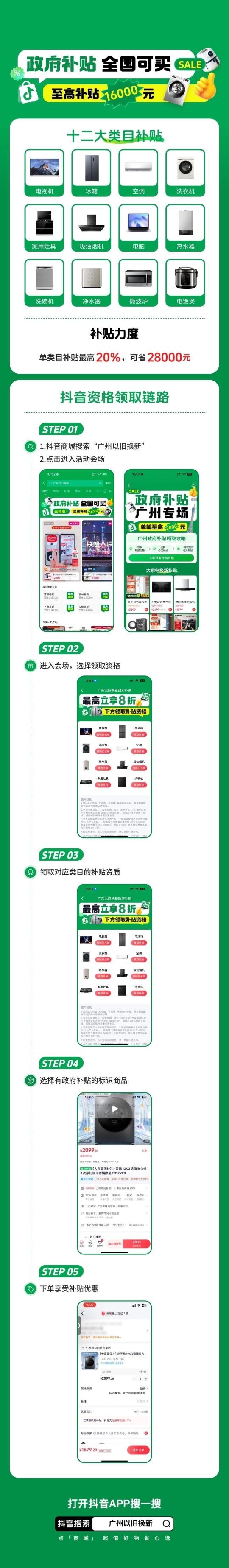 抖音已上线“广州以旧换新政府补贴”专区,联合美的、东芝、容声、海信、海尔等品牌为消费者提供丰富的选择。用户登录抖音,搜索关键词“广州以旧换新”进入“广东专区”的“广州市政府发放补贴”处领取补贴资格。消费者购买商品,将可以享受免息分期政策。