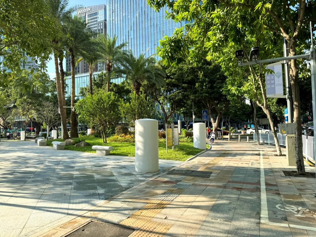 此外,天河体育中心示范段新建2处轮椅坡道,将场地四个主出入口改造成全宽式缘石坡道,消除残疾人坡道与路面接壤处的高差,严格控制路面坡度在3%以内,实现零高差过街,并使用防滑石材盲道,确保行走舒适性,打造有爱“无碍”街道。