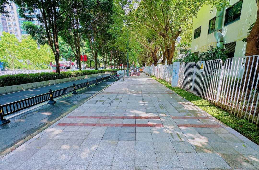 针对人行道铺装存在杂色、破损的情况,严格比选颜色,选取材质相近的石材进行替换,保证路面整体平整度与色彩和谐性。针对存在非机动车道和人行道两层围栏的情况,改造拆除人行道围栏,并将非机动车围栏更换为更为低矮、通透的样式,保障安全的同时提升街景精致感。