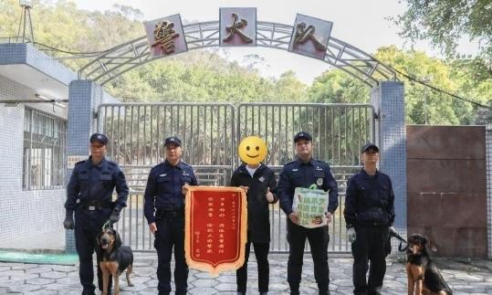 近日,市民张先生带着锦旗来到广州番禺公安警犬训练基地,感谢包括警犬及训导员在内的番禺警队及时为其找到家中失联老人。此前,张先生60多岁的父亲在番禺某森林公园失联,番禺公安快速反应、连续作战,出动“特警+警犬+无人机”联动响应,经过3天2夜的搜索,终于寻获失联老人并平安送回家中。在这场与时间赛跑的搜救行动中,番禺公安警犬队的追踪犬“顺利”“如影”“追风”配合作战,发挥了关键作用。