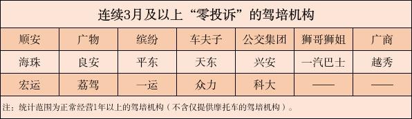投诉情况方面,市交通运输部门发布了连续3月及以上“零投诉”的驾培机构名单以及百辆车投诉量前10名的驾培机构名单。