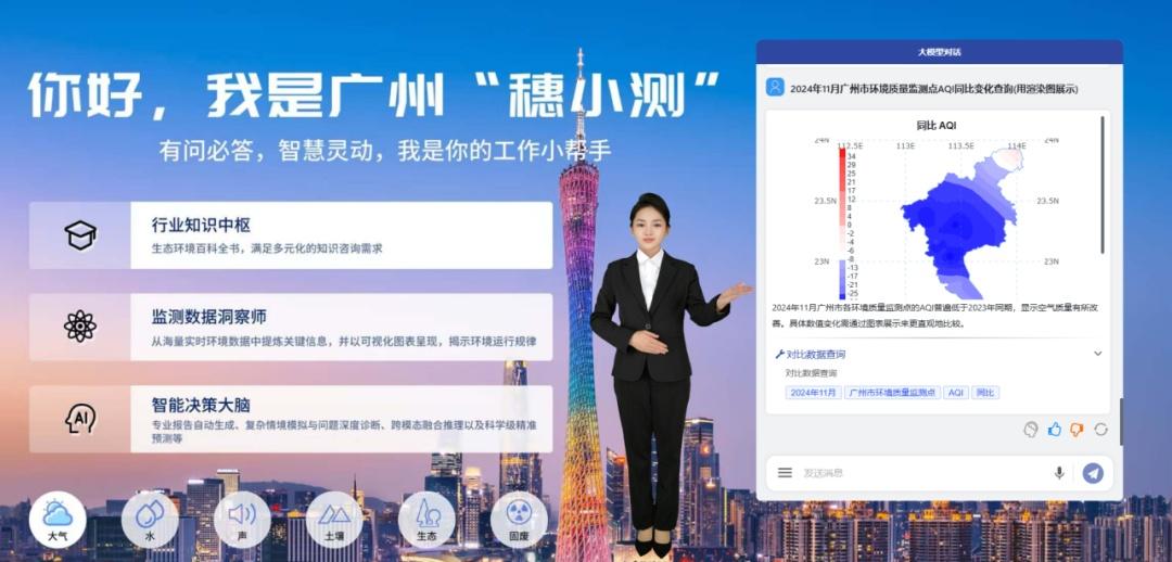 近年来,广东省广州生态环境监测中心站(以下简称广州监测站)加速推进生态环境监测数智化转型,大力推动“人工智能+”技术推广应用,将虚拟现实、人工智能大模型、三维GIS等前沿技术引入生态环境监测业务场景,成功开发“穗小测”数智助手。近日,随着DeepSeek国产AI大模型的发布,广州监测站把握先机,迅速完成接入,与原有基座大模型深度协同,大幅提升“穗小测”数智助手在复杂问题推理和多场景适配方面的能力,进一步提高工作效率、减少人为失误,并以个性化虚拟数字人形象与受众进行互动,增强体验感和参与度,提升广州数智监测品牌形象。