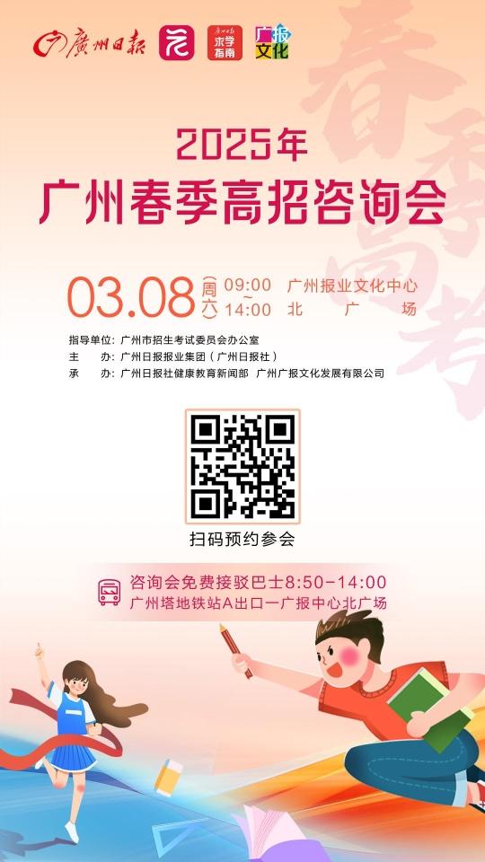 2025年广州春季高招咨询会由广州市招生考试委员会办公室指导,广州日报报业集团(广州日报社)主办,广州日报求学指南工作室、广州广报文化发展有限公司承办。