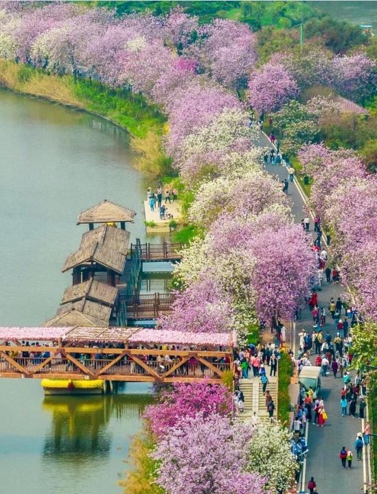 粉色的花海绵延不绝,与河水、绿树相互映衬,犹如春天使者,将春日浪漫渲染得淋漓尽致。
