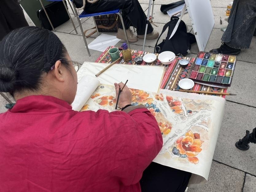 这次红棉主题写生活动,也吸引着外地画家踊跃参与。其中,中国美术家协会会员唐艳专程从湛江赶来广州,“举办这类活动很有意义,收获满满,让我更加深入了解广州这座有着光荣革命传统、深厚红色基因的英雄城市”。在这次写生创作中,她完成了一幅1.36米长的木棉国画。展开画卷,一朵朵栩栩如生、色彩斑斓的木棉跃然纸上,金黄色、橙红色、艳红色的木棉花朵肆意盛开着,形态各异,明媚灿烂,尽显蓬勃生机,周边还有数朵用石青色点染的花骨朵含苞待放,神韵十足,引得不少路人驻足点赞,“在色彩运用上,我倾向于采用重彩形式描绘木棉,通过撞水撞粉技法,将各种色彩交织融合,这样既能展现春天的缤纷多彩,也更能彰显英雄花木棉背后炽热的革命精神。”