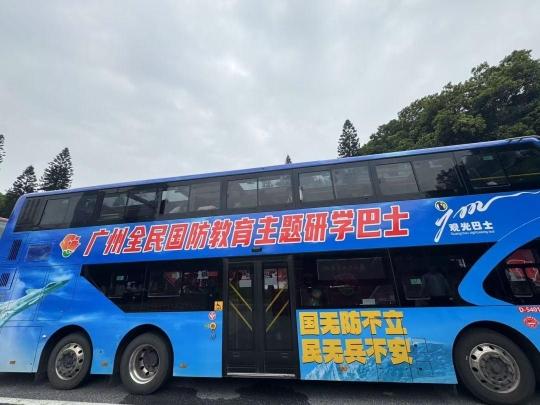 “红旗-12”发射车、“山东舰”……走进深蓝色的广州全民国防教育主题研学巴士,首先映入眼帘的便是整齐摆放的军事武器模型。作为移动的“国防课堂”,研学巴士融入国防军事与大国重器等硬核元素,研学路线以承载革命历史记忆的广州起义烈士陵园为起点,目的地设在广州市国防教育中心,巧妙运用“车行一路、课讲一程”的浸润式教学模式,让青少年在行进中感受国防建设的时代脉动。