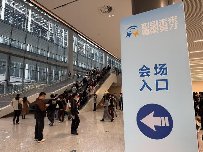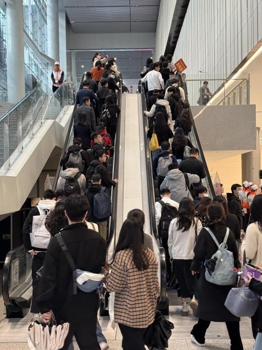 16日上午,记者在现场看到,众多前来应聘的学生等求职人员已早早地等候在入口处,不少组团前来的学生纷纷在照片现场合影。