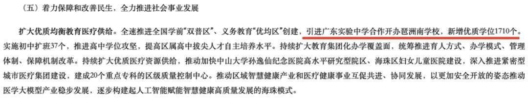 《报告》在2025年经济社会发展计划安排建议部分,与教育有关的信息值得重点关注:扩大优质均衡教育医疗供给。全速推进全国学前“双普区”、义务教育“优均区”创建,引进广东实验中学合作开办琶洲南学校,新增优质学位1710个。实施初中扩班37个,推进高中学位攻坚,提高区属高中拔尖人才自主培养水平。