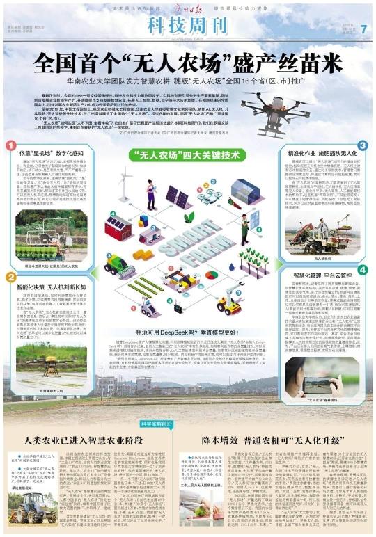 早在2019年,中国工程院院士、我国农业机械化工程专家、华南农业大学教授罗锡文就带领团队,依托AI、无人机、北斗导航、无人驾驶等先进技术,在广州增城建设了全国首个“无人农场”。经过6年的发展,穗版“无人农场”已推广至全国16个省(区、市)。