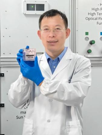 王猛教授展示镍氧化物La3Ni2O7单晶(图源:中山大学)