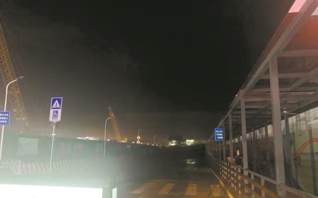 记者注意到,在万顷沙地铁站附近就有一个南沙巴士有限公司的公交站,那里是有照明灯的,但对于那些出了地铁站后需要去搭乘出租车或网约车的市民,则需要步行一段距离,在连廊中“摸黑前行”,因为连廊中的路灯不亮。