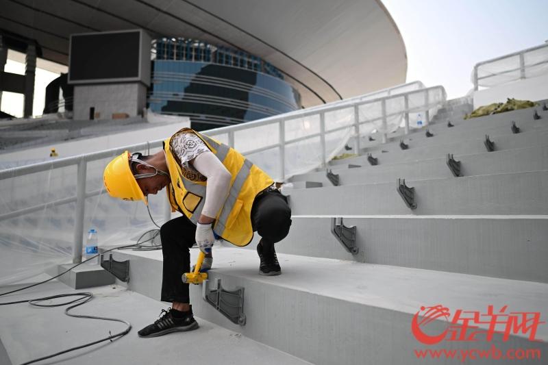 工人在十五运会主场馆广东奥林匹克体育中心内工作。
