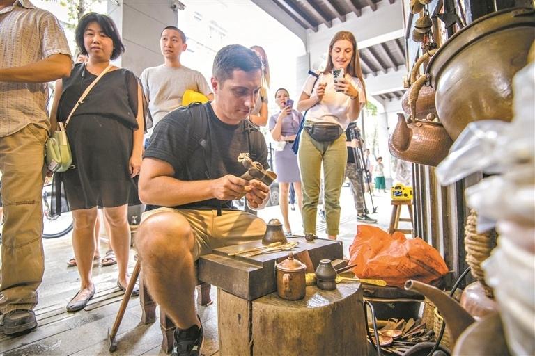 外国友人来到恩宁路,兴致勃勃地体验打铜工艺。(资料图片)