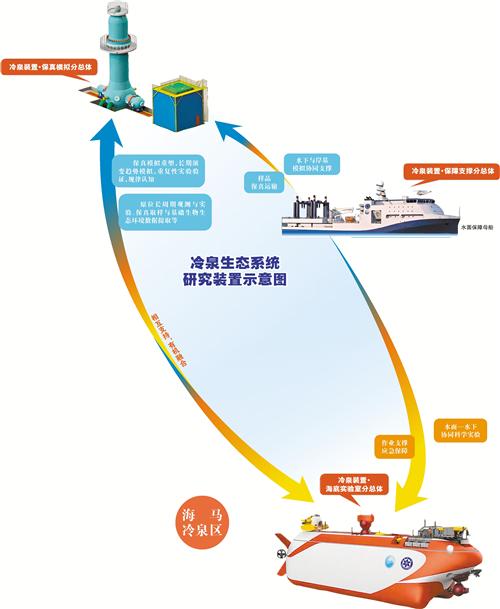 冷泉装置的保真模拟分总体是唯一建在陆地上的实验室,它将建成国际最大尺度的冷泉生态系统与可燃冰成藏开采模拟实验装置,在实验室内模拟深海的环境去研究冷泉生态系统。