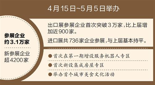 本届广交会展览总面积155万平方米,展位总数约7.4万个,参展企业约3.1万家。其中出口展展位数近7.3万个、参展企业首次突破3万家,比上届增加近900家。进口展展位数约1600个,来自50个国家和地区的736家企业参展,与上届基本持平。值得一提的是,本届广交会还首次在第一期增设服务机器人专区,集中展示我国人工智能发展最新成果。