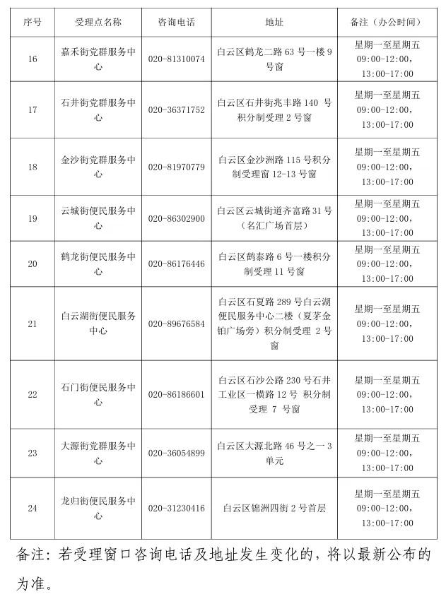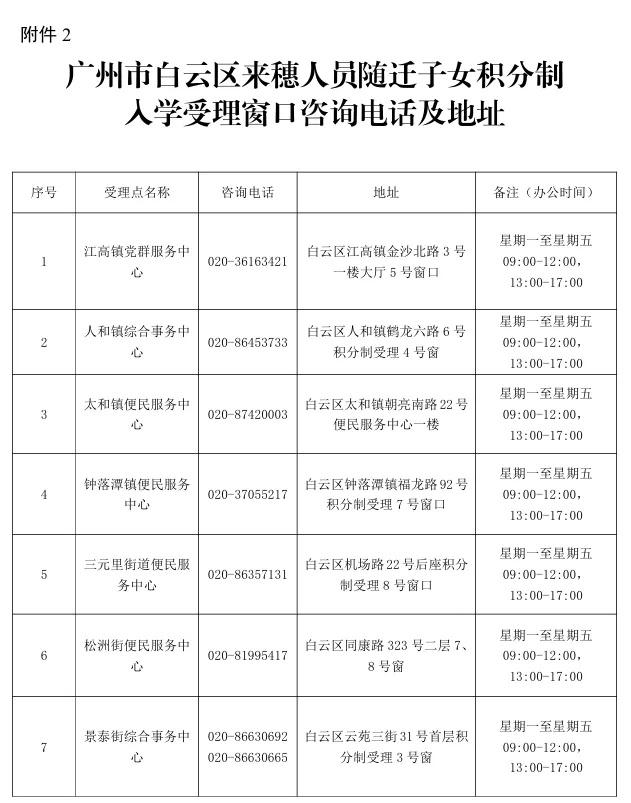 广州市白云区来穗人员随迁子女积分制入学受理窗口咨询电话及地址: