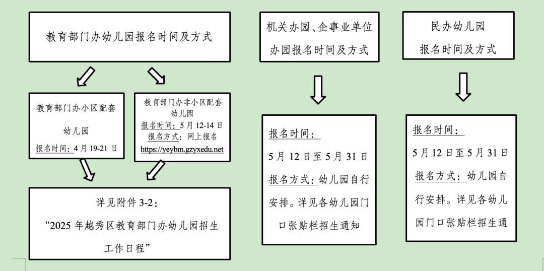 4月9日,广州市越秀区教育局发布《关于做好2025年幼儿园招生工作的通知》(下称《通知》)。《通知》显示,区教育部门办小区配套幼儿园面向小区业主子女招生报名时间为4月19日至4月21日、面向社会招生网上报名时间为5月12日至5月14日。