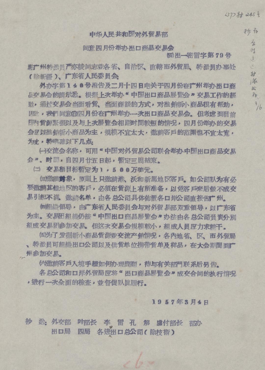 《中华人民共和国对外贸易部同意四月份举办出口商品交易会》(19570304)