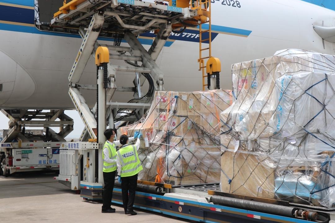 广交会开幕前夕,广州白云机场海关关员对进口货物进行机边监管。