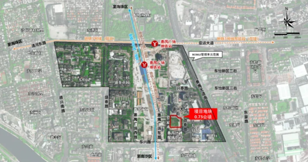 项目地块用地面积0.73公顷,地理位置优越。南接番禺区融媒体中心,北距地铁3号线、18号线番禺广场地铁站约500米。在东西向上衔接番禺广场与区工人文化宫,塑造出层次分明、错落有致的城市天际线景观。