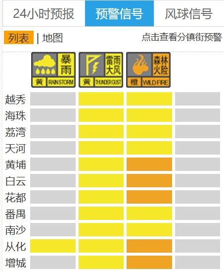 截至4月12日14时30分,广州天气官网发布的实时天气预警信号。另外,据市气象台监测,广州市达到启动气象灾害(雷雨大风)Ⅳ级应急响应标准。市气象灾害应急指挥部决定从4月12日13时30分起启动广州市气象灾害(雷雨大风)Ⅳ级应急响应。有关部门表示,要按照预案规定做好防御工作。