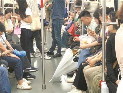 在地铁上,部分乘客未将雨伞收好,也没有用塑料袋装好雨伞,任由湿漉漉的雨伞挨着其他乘客。还有乘客将雨伞随地摆放,不仅占据空间,还造成地面湿滑。有乘客搭乘公交时,随手将湿漉漉的雨伞或雨衣放在邻座,造成座位潮湿,给车上的其他乘客带来不便。遇到车上人多时,还会有乘客被未收好的雨伞弄湿鞋袜、衣裤或背包。