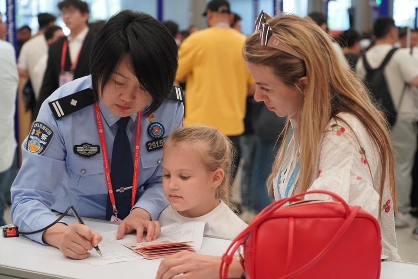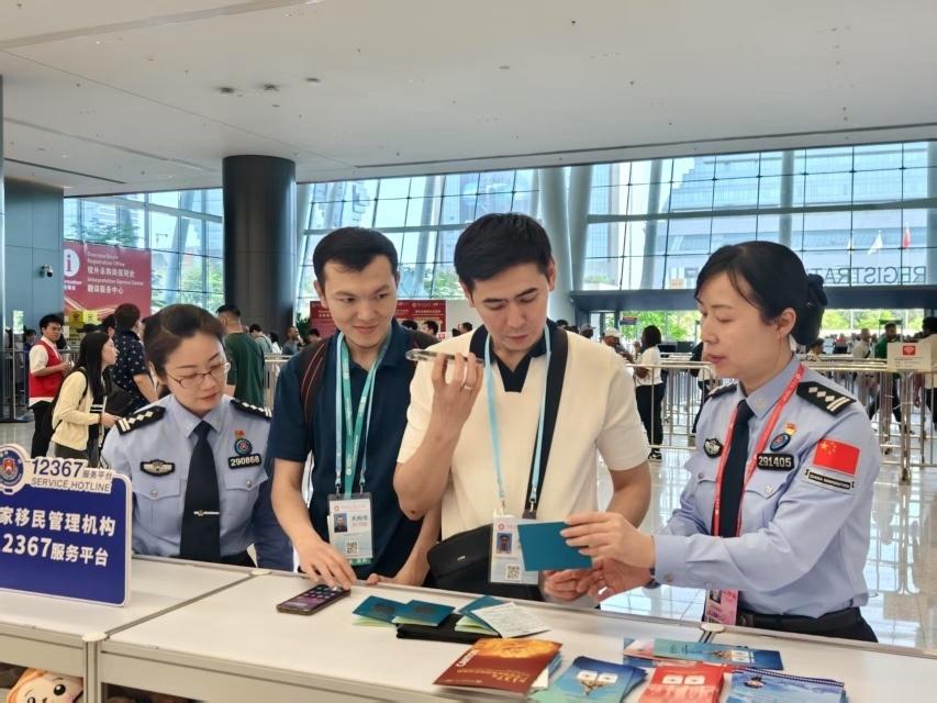 现场有时也会出现意外的“突发情况”。一家新能源汽车在肯尼亚最大的经销商忘记带护照办不了证,参展商非常着急。天河边检站民警立即联系对外贸易中心工作人员,经请示上级决定特事特办。随后,天河边检站民警协助客商通过国家移民管理局12367查询出入境记录,核对护照照片及工作签证,顺利为该客商办好采购代表证。