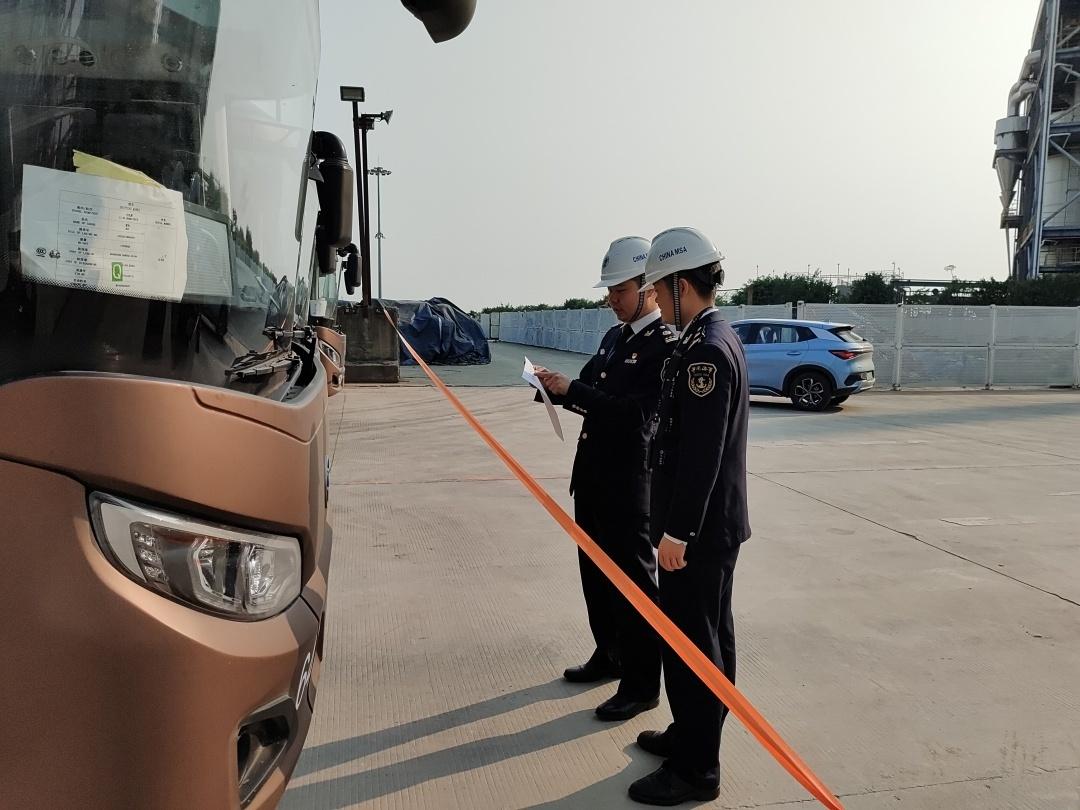 为确保大巴顺利出海,广州海事部门提前介入服务,前期通过建设“一船一策”服务档案,主动对接广州港集团、代理公司等企业。广州海事部门精准把握国际规则,展现海事专业能力,充分利用《国际海运危险货物规则》的相关特殊规定,确保车辆动力系统符合安全规定,并指导督促码头完成电池防短路处理,确认该批次大巴满足规定可以作为普通货物出运,为服务南沙港国际贸易顺畅通关与高效运输展示海事担当。此外,执法人员严格核查船舶适装证书、消防设备的配备和是否采用专业绑扎固定方案等情况,重点关注燃油大巴的柴油存量及电池断电情况,督促船方严格落实有关规定,确保后续海上运输安全。