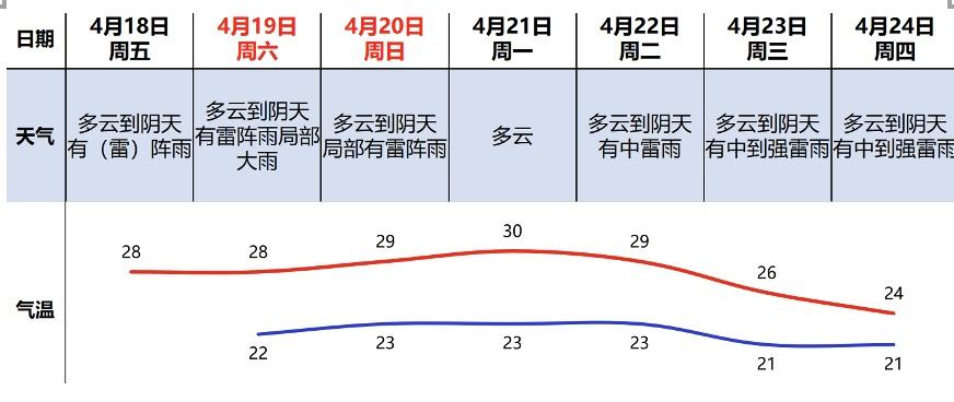 4月18日,市防汛防旱防风总指挥部办公室与市气象局、省水文局广州水文分局对我市未来七天的气象水文情况进行了会商。会商结论意见指出,预计,未来七天广州以多云到阴天为主,雷雨渐趋明显。18日至19日,受高空波动和低层偏南气流影响,有雷阵雨局部大雨,20日至21日雷雨减弱。22日起,受冷空气和切变线影响,有一次明显降水伴强对流过程,23日午后、24日白天至25日上午是对流多发时段。